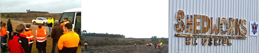 Students from Denmark Agricultural College learning about plantation management with PF Olsen; students from Denmark Agricultural College planting trees; creative Shedworks sign.